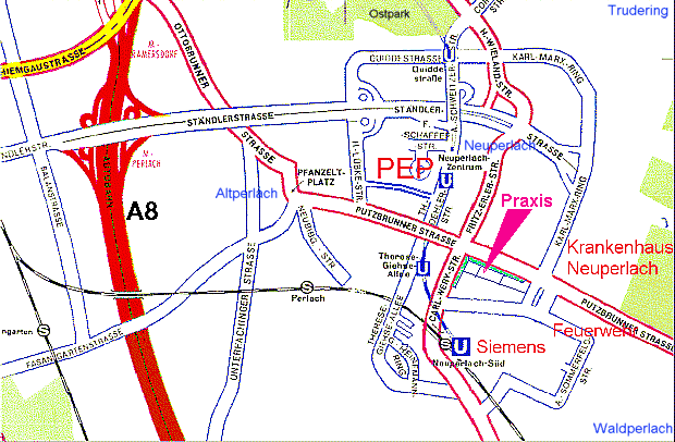 Die Praxis liegt in München Neuperlach in der Putzbrunnerstrasse, stadtauswärts auf der rechten Seite,